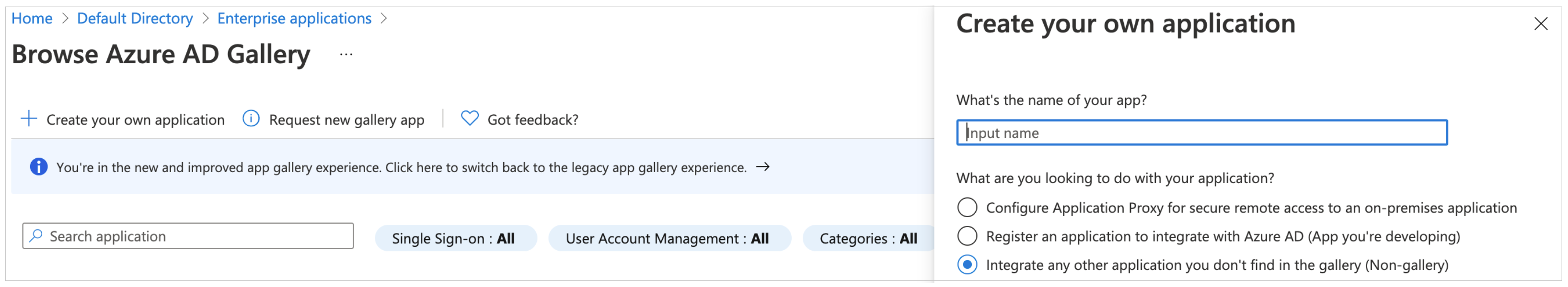 Under What’s the name of your app?, enter a name for your application and select Integrate any other application you don’t find in the gallery (Non-gallery), as shown in below. Choose Create.